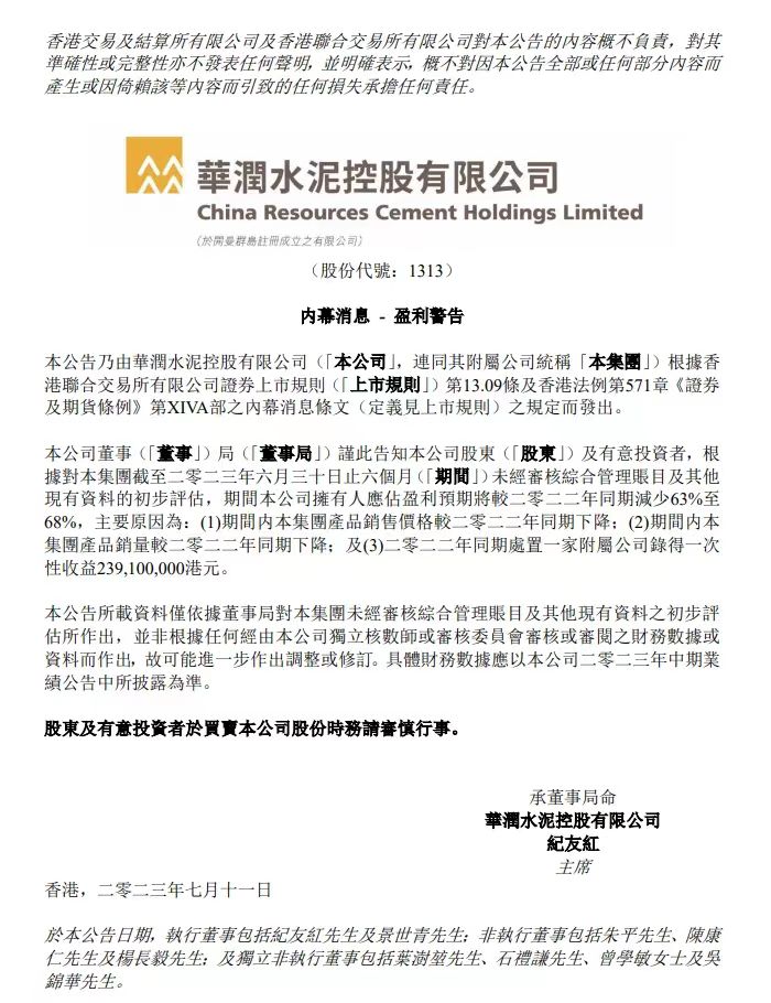 同日,華潤水泥控股7月11日在港交所公告,該集團預期于2023年上半年公司擁有人應占盈利同比減少63%至68%。期間內集團產品銷售價格較2022年同期下降;期間內集團產品銷量較2022年同期下降;2022年同期處置一家附屬公司取得一次性收益約2.39億港元。