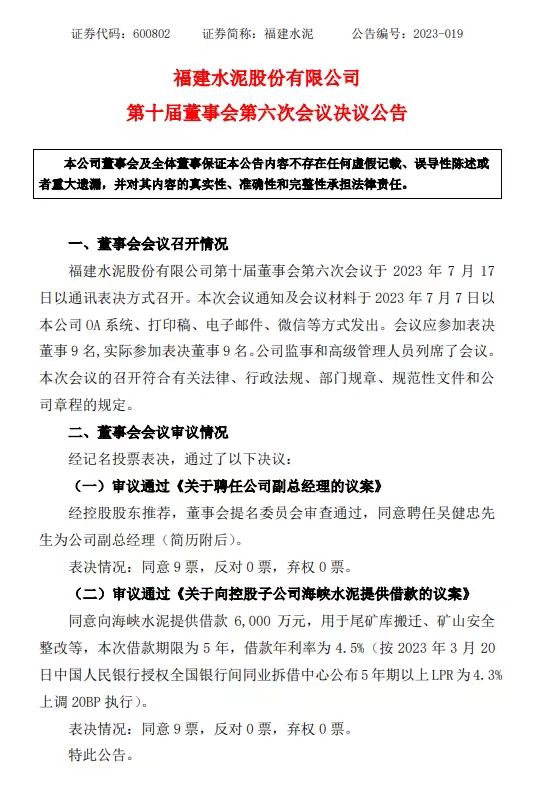 同期,公告審議通過《關(guān)于向控股子公司海峽水泥提供借款的議案》同意向海峽水泥提供借款6,000萬元,用于尾礦庫搬遷、礦山安全整改等,本次借款期限為5年,借款年利率為4.5%。