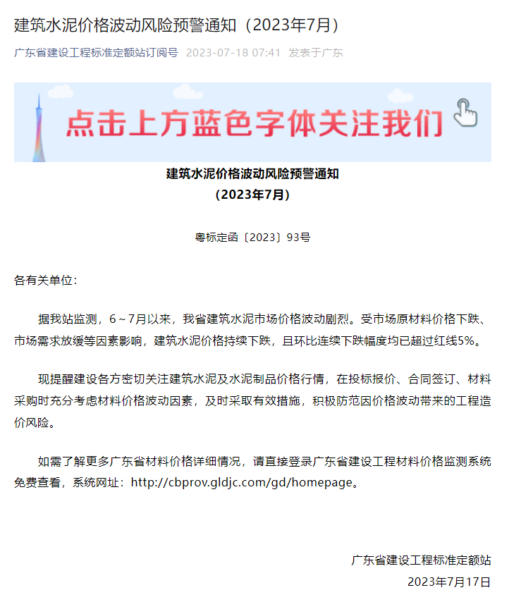 日前,廣東省建設工程標準定額站發布建筑水泥價格波動風險預警通知稱,6~7月以來,廣東省建筑水泥市場價格波動劇烈。受市場原材料價格下跌、市場需求放緩等因素影響,建筑水泥價格持續下跌,且環比連續下跌幅度均已超過紅線5%。