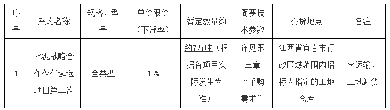 7月25日,江西省公共資源交易平臺發布江西中宜招標咨詢有限公司關于水泥戰略合作伙伴遴選項目公開招標公告。公告項目預算金額:2800萬元,數量約7萬噸。交貨地點在江西省宜春市行政區域范圍內招標人指定的工地倉庫。含運輸、工地卸貨單價限價(下浮率)15%。服務期限:自合同簽訂之日起至2024年12月止。公告全文如下: